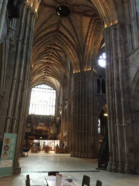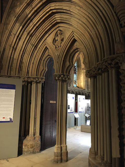 Then followed the s and n transepts in that order, both given a comprehensive working over in the late Middle Ages, and the chapterhouse & its long, dark richly decorated vestibule. More cave. The chapter house is a two storey structure, polygonal - octagonal or decagonal you decide! It's been described as both. Either way it is rather domestic in scale with little of the monumentality one associates with the great polygonal chapterhouse of such places as York and Lincoln, and none the worse for that. It currently functions as a sort of cathedral museum containing, amongst other things, two valuable Anglo-Saxon pieces of art: a fragment of sculpture - one of the scant remains of the Anglo-Saxon cathedral - and the manuscript folio The Lichfield Gospels aka The Llandeilo Gospel Book. Look for the Late Medieval painting over the entrance. Upstairs (not open to the public) currently holds the cathedral library and has done since the 18th century and the demolition of the old medieval library which stood to the north of the nave.